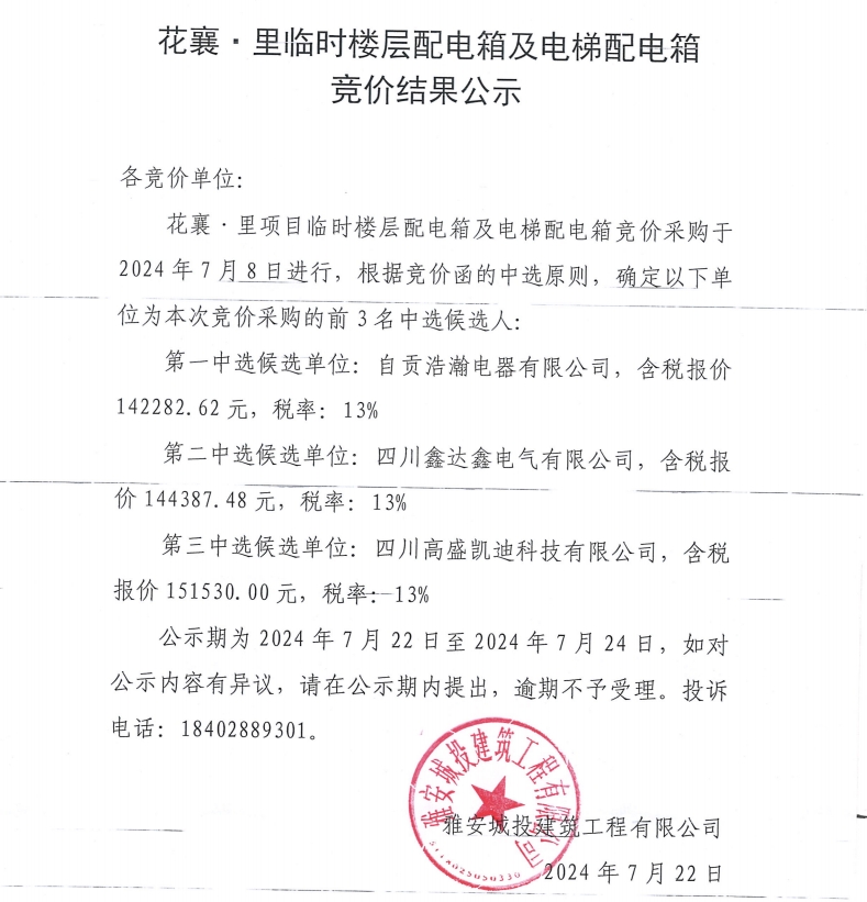 花襄·里臨時樓層配電箱及電梯配電箱競價結(jié)果公示