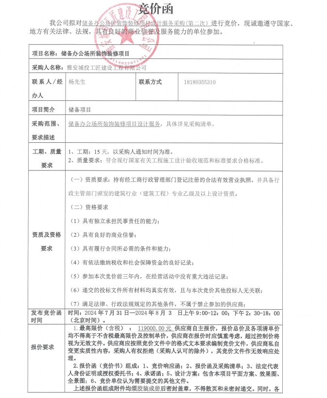 儲備辦公場所裝飾裝修項目設計服務采購(第二次)競價公告