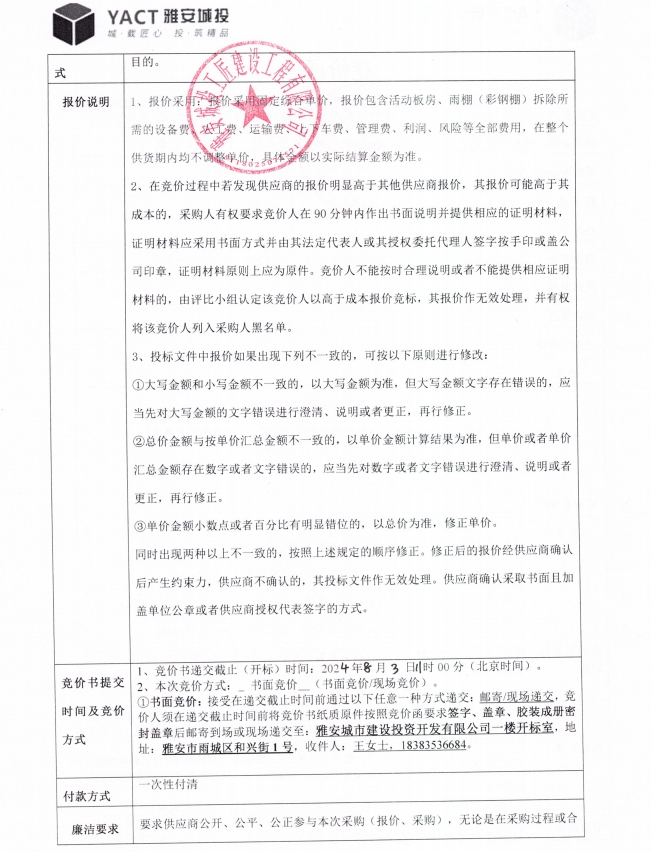 附件2:雅安市大興生態(tài)旅游建設(shè)項(xiàng)目舊活動(dòng)板房出售競(jìng)價(jià)函