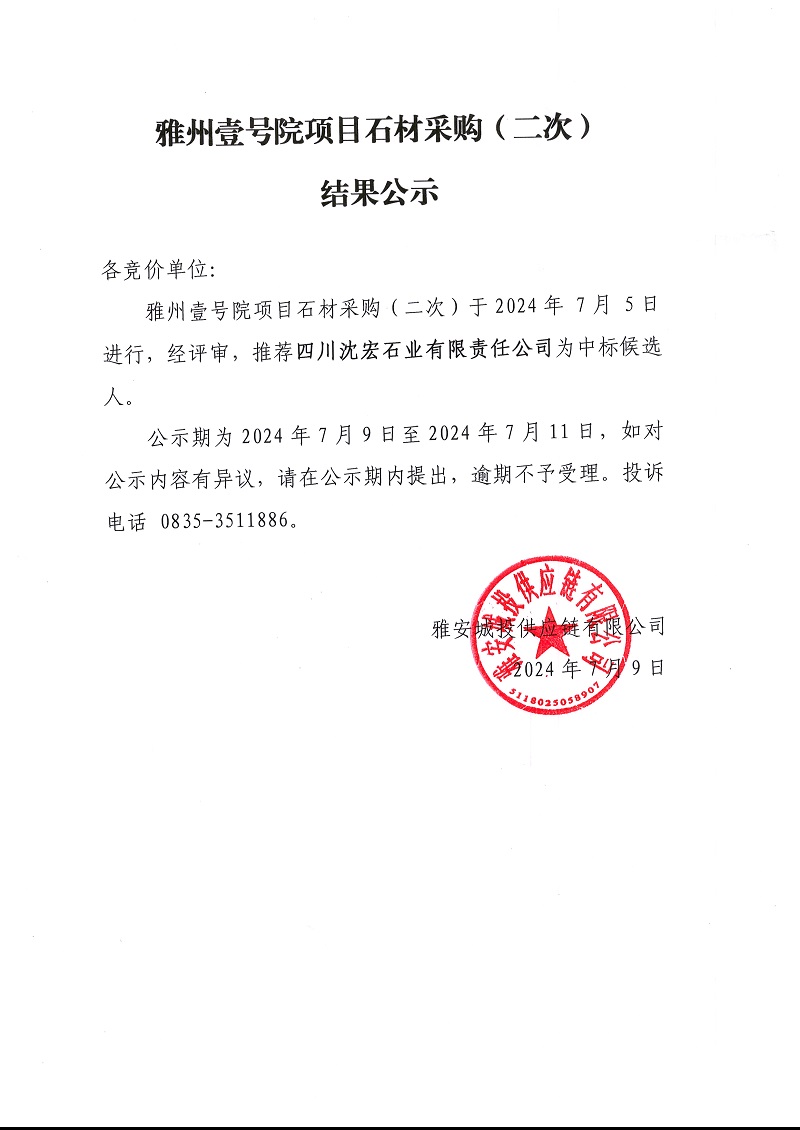 雅州壹號院項目石材采購(二次)結(jié)果公示