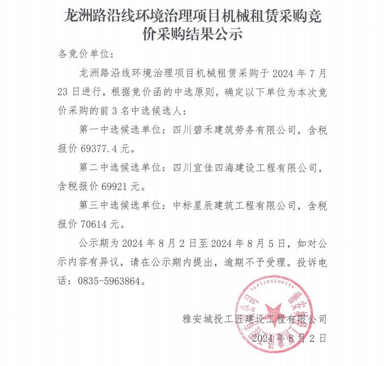 龍洲路沿線環(huán)境治理項目機(jī)械租賃采購競價采購結(jié)果公示