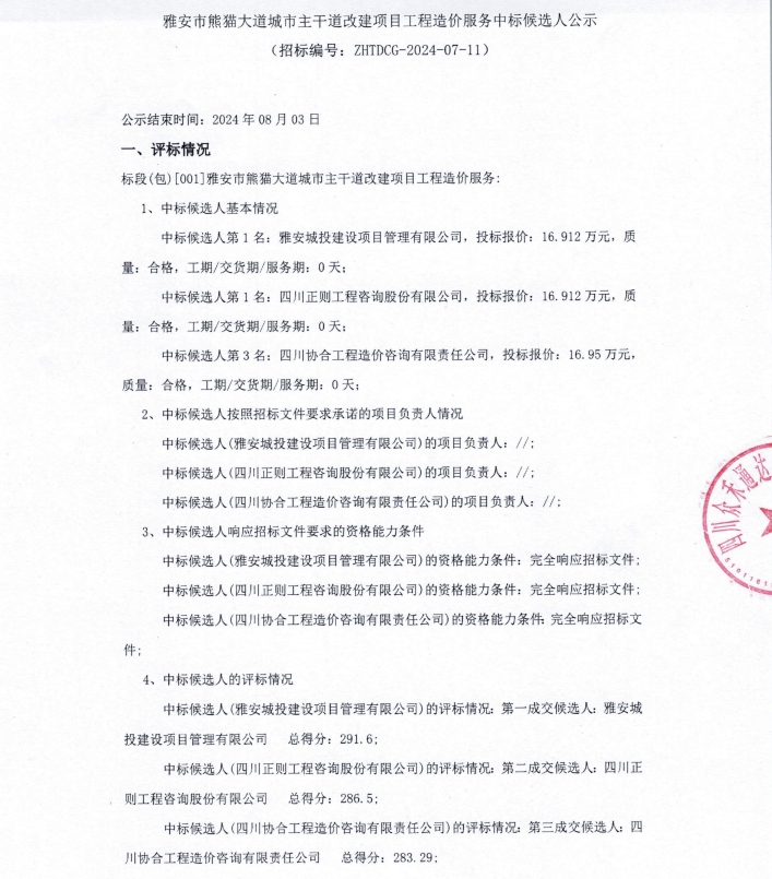 雅安市熊貓大道城市主干道改建項目工程造價服務中標候選人公示