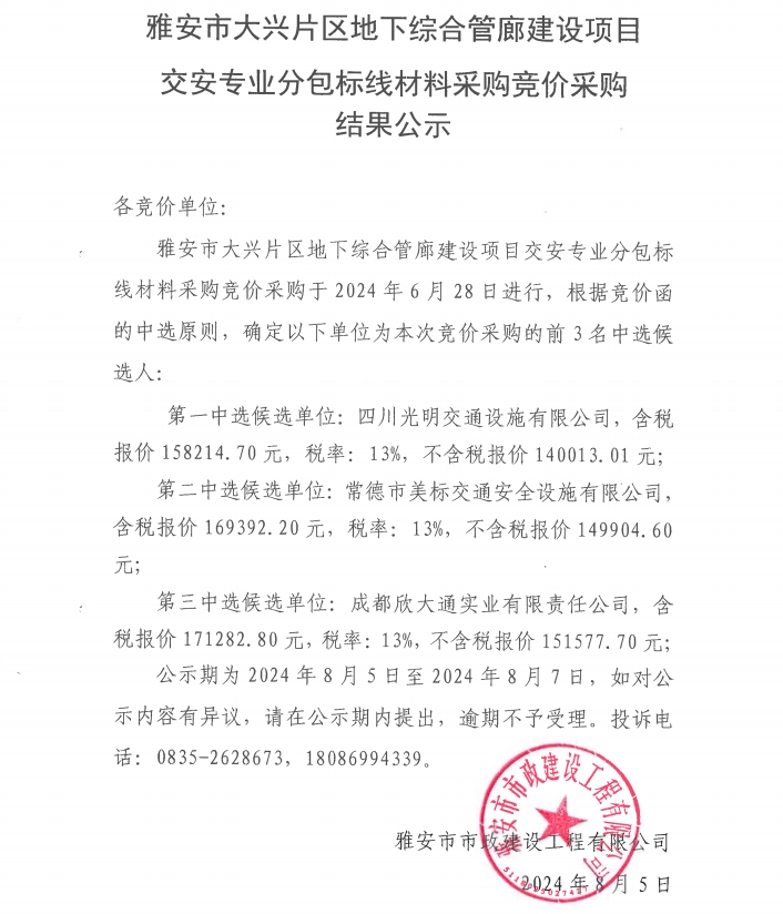 雅安市大興片區(qū)地下綜合管廊建設(shè)項(xiàng)目道路專業(yè)分包標(biāo)線材料采購競價采購結(jié)果公示