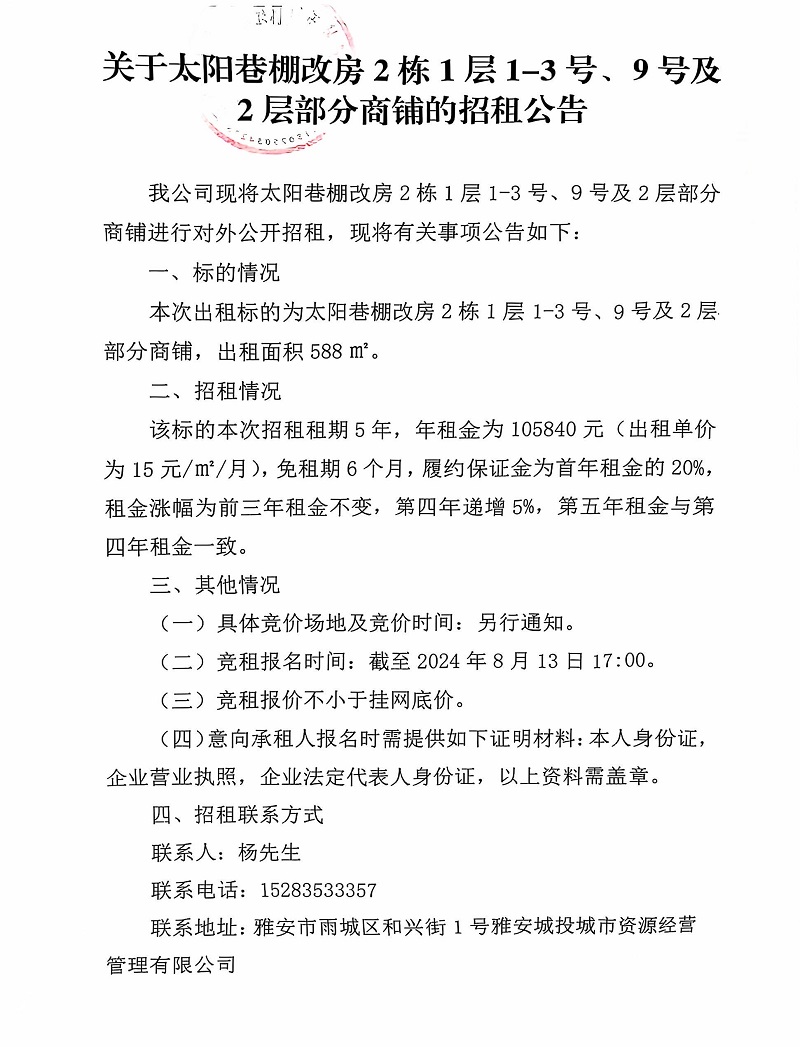 關于太陽巷棚改房2棟1層1-3號、9號及2層部分商鋪的招租公告