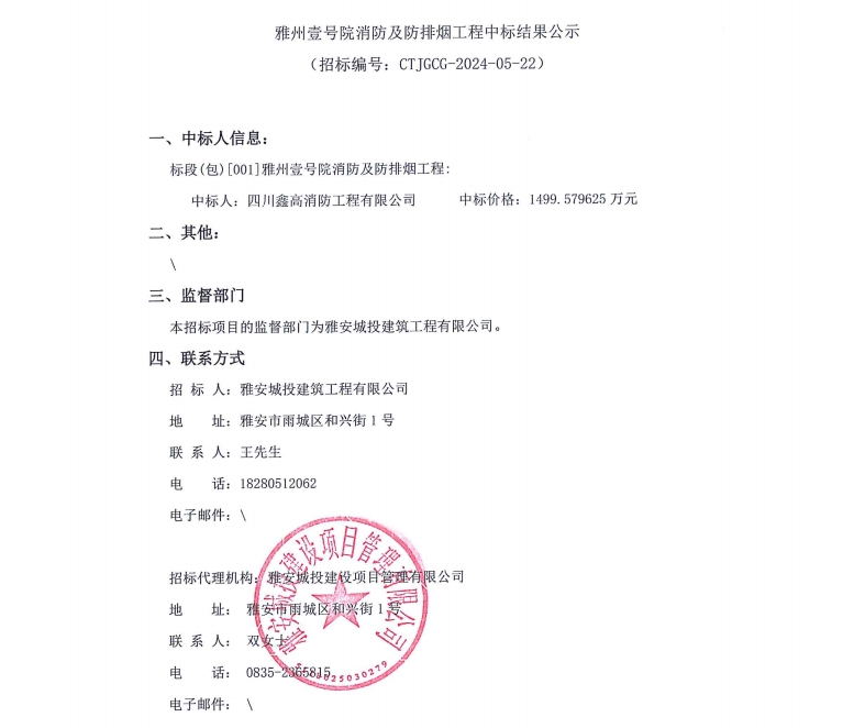 雅州壹號(hào)院消防及防排煙工程中標(biāo)結(jié)果公示