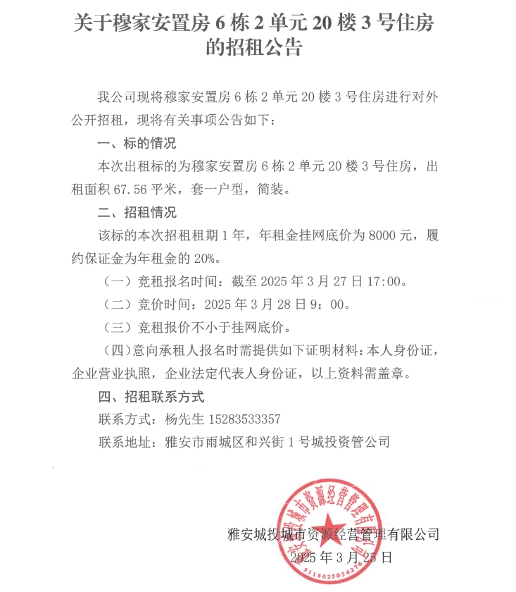 關(guān)于穆家安置房6棟2單元20樓3號(hào)住房的招租公告