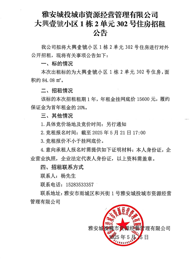 雅安城投資源經(jīng)營管理有限公司大興壹號(hào)小區(qū)1棟2單元302號(hào)住房招租公告