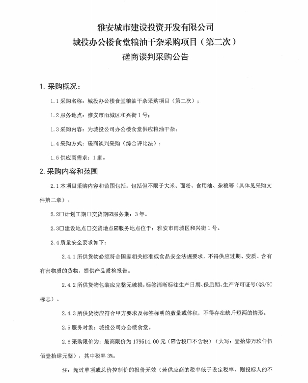 雅安城市建設(shè)投資開(kāi)發(fā)有限公司辦公樓食堂干雜采購(gòu)項(xiàng)目(第二次)磋商談判采購(gòu)公告