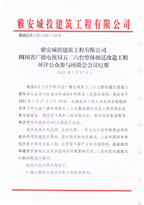 雅安城投建筑工程有限公司四川省廣播電視局五二六臺整體搬遷改造工程環(huán)評公眾參與座談會會議紀要