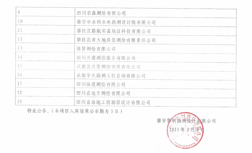 雅安黎明勘測設(shè)計有限公司測繪服務(wù)勞務(wù)單位入庫項(xiàng)目公開招募結(jié)果公示